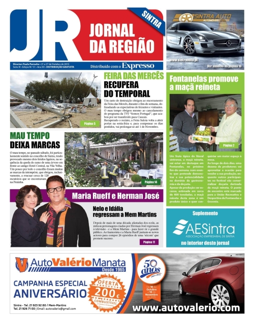 Jornal da Região destaca que a Feira das Mercês volta a abrir portas na sexta-feira e, para compensar os dias perdidos em consequência do temporal do último fim de semana, irá prolongar-se até dia 1 de Novembro. Destaque também para mais um Festival da Maçã Reineta em Fontanelas, no próximo sábado e domingo. [